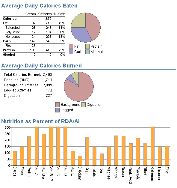As you can see, the diet was a little light on Calcium and just a hair under on Iron too. However for the most part I was not only meeting but substantially exceeding the amount of nutrients it is recommended we each eat in a given day. The fiber, like many of the other nutrients, were a full 50% higher than recommended levels. That is really good! For the full paleo diet experiment I’ll figure out ways to bump up the Calcium and Iron levels, but for just a week this is a pretty solid start. The other thing that jumps out is the distribution of calories. Almost 50% of my calories are coming from fat. That probably has a lot to do with the consumption of avocado in a lot of meals among other things. The amount of saturated fat is high as well. This is one of those areas of contention with people who recommend a diet that follows “traditional” heart healthy guidelines (low fat, reduced or eliminated saturated fat) with these paleo/ancestral diet plans. The blood work at the end of the three month cycle will do wonders for determining how my body reacts to these far greater concentrations of fats, cholesterol and saturated fats.