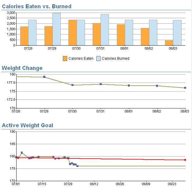 Within a week I wasn’t expecting tremendous changes in mood or weight, however my weight plummeted on this one week of the diet, as you can see by the above graphs. I started the week at 179.6 pounds and I ended it at 176 pounds. That’s a 3.2 pound weight change over just one week. However as you can see it wasn’t gradual. I literally woke up one morning over two pounds lighter than the morning before. I weigh myself at the same time of day, about a half hour after waking up before I consume anything. That way I get pretty much consistent measurements, but you can still see up to a pound swing by just changes in how your body is retaining water or how much you ate the day before. This wasn’t a fluke however, since it kept that lower level for the entire week. You can see it best on the “Active Weight Goal” chart. This chart tracks how I want my weight to change over the months of July, August and September where I’m shooting to lose 1/3 of a pound for each of the months. The fall off is dramatic, and it can’t be due to fat or muscle loss. It has to be because of something else going on with my body composition. What it is I do not know.