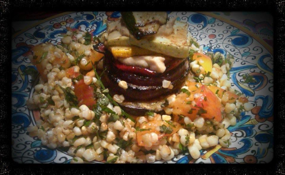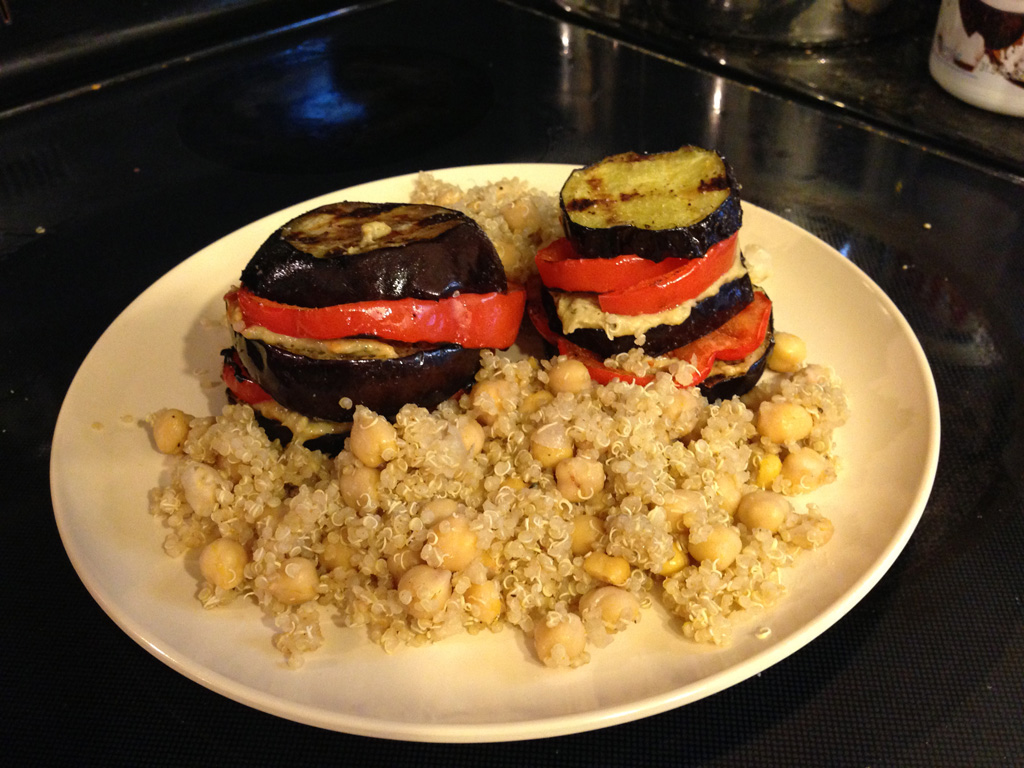 Once again, my routine was supposed to be to go on my 4-5 mile run then make dinner then get some house stuff done. I was spent enough from the day that I just 86’d the run and went right to dinner. My friend, Eric, has been suggesting tons of recipes and even gave me one of the recipes for one of his own creations: Eggplant Towers with Quinoa and Garbanzo Beans. I’ll be blogging the full recipe at a future point in time, but the essence is very easy. You basically slice and grill some eggplant and red peppers. At the same time you cook up some quinoa. When all is done you add some garbanzo beans (chickpeas) to the quinoa and let them come up to temperature. You then stack alternating slices of eggplant and peppers, with some hummus between each layer. Mine turned out like this: