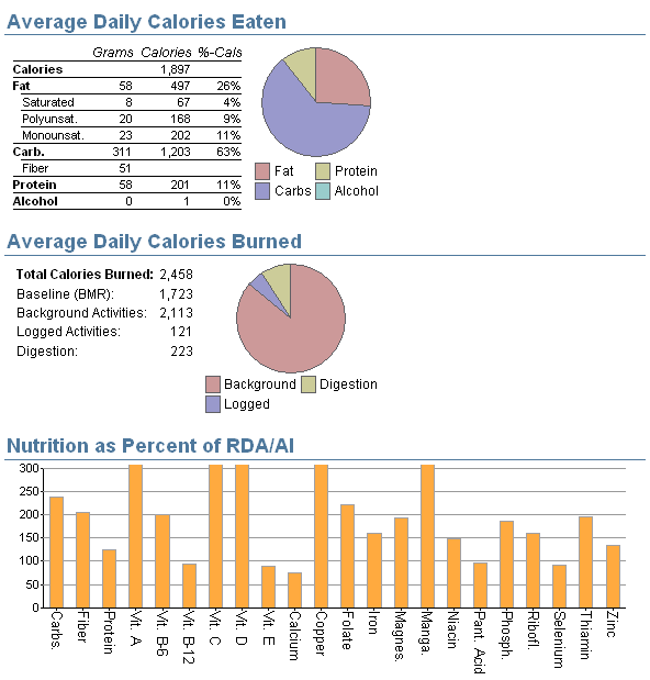 Let’s dissect the above graphs one by one. First we have the break down of where my calories are coming. While fat is in the pretty standard 25% area, carbohydrates are taking up almost all of the rest of it. My average daily protein intake is just 58 grams. As a point of reference, it was almost twice that on the paleo plan and in how I eat regularly. There is a lot of variance on recommendations for protein intake. According to WebMD the minimum intake for adult men is 56 grams per day. I was eating a meager two grams above that, however that was with a pretty active workout schedule. The rule of thumb one often sees is really based on body weight, which is a good way to look at it, and this ranges anywhere from 0.4 to 1 gram per pound of body weight. That would mean that I should be looking at trying to consume between 80 and 180 grams of protein every day. I obviously fell well short of that. Looking at micronutrients (vitamins and minerals) I didn’t do too poorly overall. I exceeded 100% of the recommended daily allowance for most things, including 150% for iron and over 200% for fiber. I was missed the mark by just a bit on some other essential nutrients like Vitamin B-12, Vitamin E and Selenium. I totally missed the mark on calcium though.