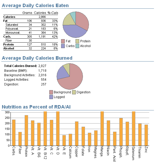 Although everything looked good from a numbers perspective, I’m not thrilled with the quality of food that I had over the month, food and wine excluded. Too high a percentage of my calories were from essentially junk. A full 7% came from beer and wine. Another 3% each came from sushi and cheese (the sushi I don’t mind so much). Another 2% each came from pizza crust, Nature Valley bars, my home made granola bars and ice cream and apple pie. I wouldn’t mind if one or two of those on the list (minus the sushi) were there, but the fact that the top 25% of my calories came from junk food, and probably more that didn’t get enumerated, is not making me happy. I know I can do better than that, and will on these food plans.