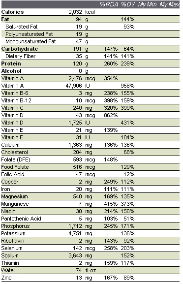 Nutrition wise things are looking a lot better than last week. Almost across the board my intake of all vitamins and minerals went up. I made up some lost ground on some nutrients I wasn’t hitting 100% of Daily Value on, especially the calcium, thiamin and iron. At the same time I still am missing the mark just a little bit on Zinc and Riboflavin. These are still hovering just above or below 90% so this isn’t an actual case of malnourishment, but at the same time I would ideally have all of these above 100% for the week.