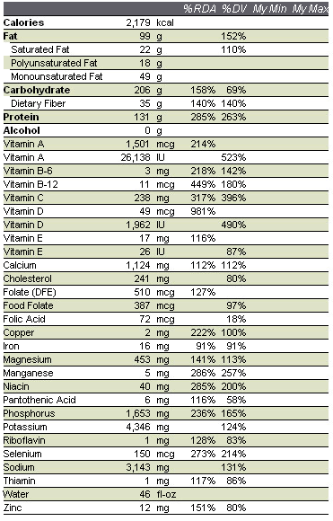 As you can see things are looking pretty piss poor on Vitamin E, Riboflavin, Thiamin and Zinc. For once I’m also a bit low on Food Folate and Iron too. What I’m especially not happy about is that that Calcium levels are just over 100% but that is with me taking a Calcium supplement too. I really don’t like having to take a supplement anyway, but I need to for Vitamin D (the one vitamin I don’t mind since a lot of Vitamin D is supposed to come from sunlight). The fact that even with supplementation Calcium is just over 100% means I need to do a better job eating calcium. For most people they head right to the “cheese and milk” visualization of how to do that. Actually, vegetables can be quite high in calcium as well. So, once again this goes back to I’m not eating enough vegetables. I really need to get onto to that stat!
