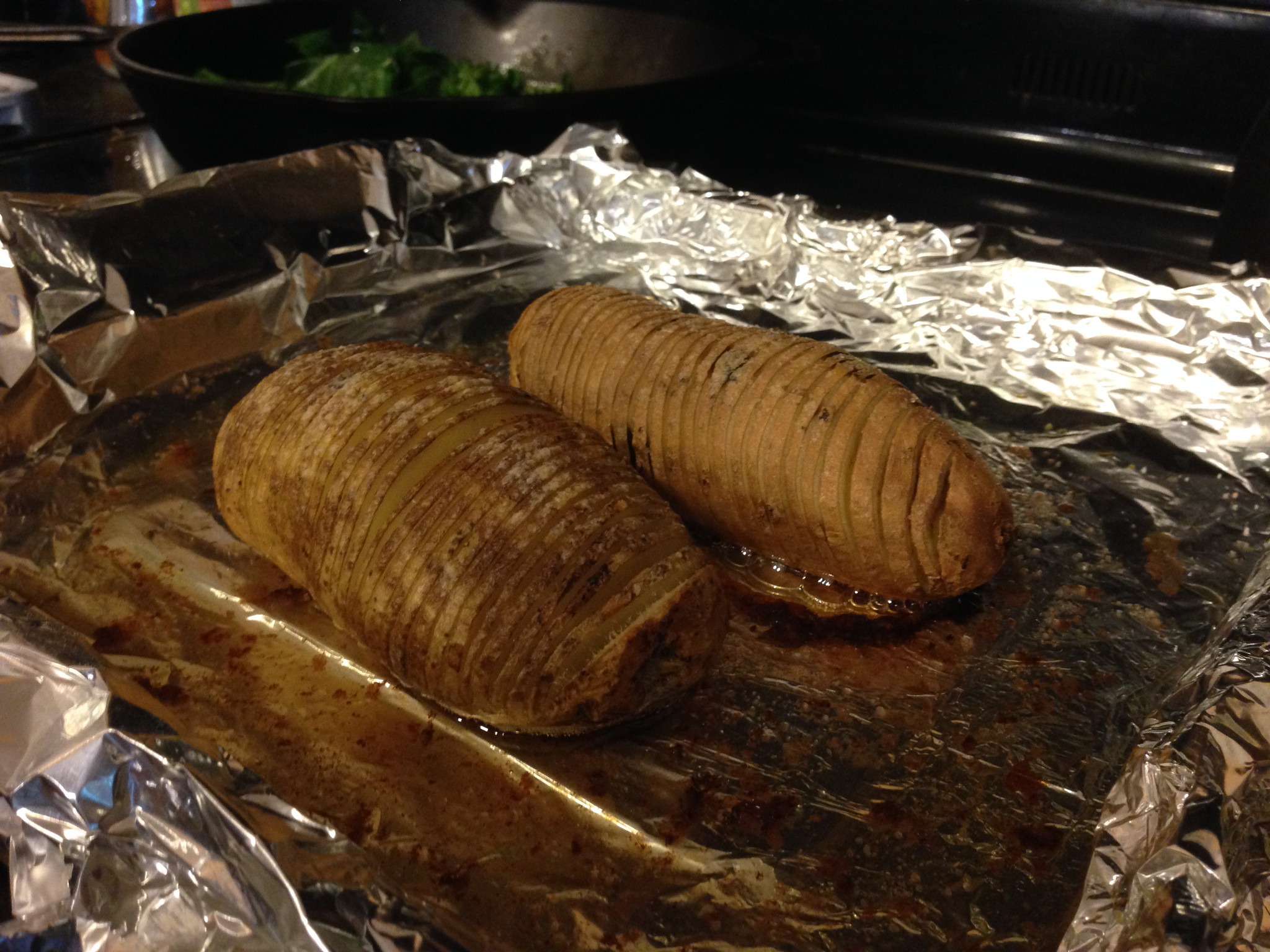 The premise behind this isn’t hard at all. You wash and dry your favorite potato. You then carefully slice most of the way through the potato, creating these fine little fins. I made mine about an eighth of an inch thick or less. I started on the one end and carefully sliced. Once I got half way around I flipped the potato around and continued. This way I didn’t have to worry about cutting myself at some point. Now that they were cut I transferred them to an aluminum foil lined lipped baking sheet.