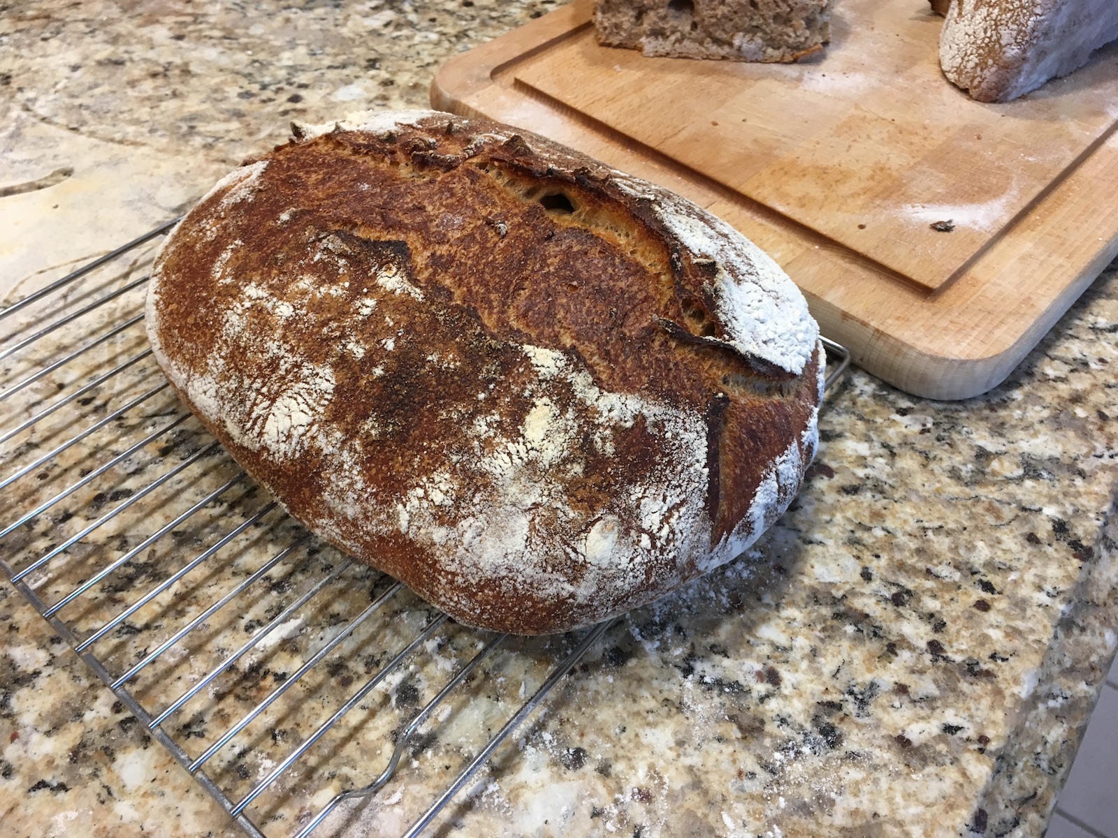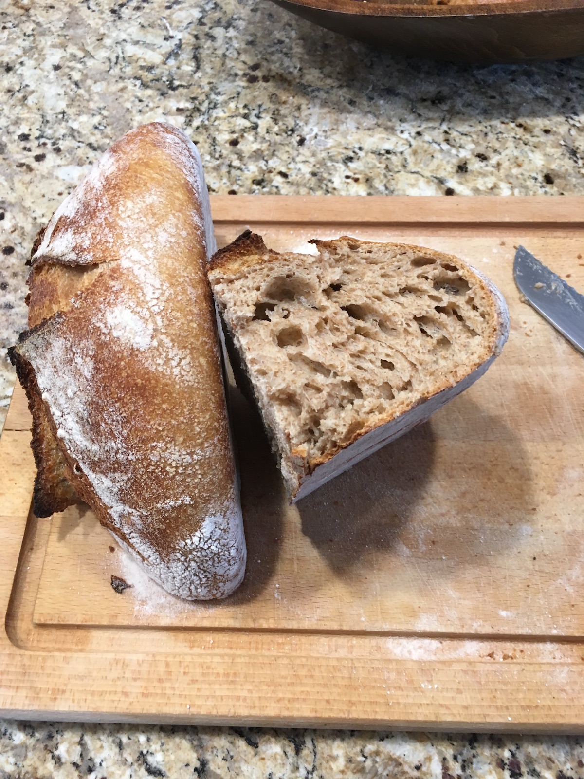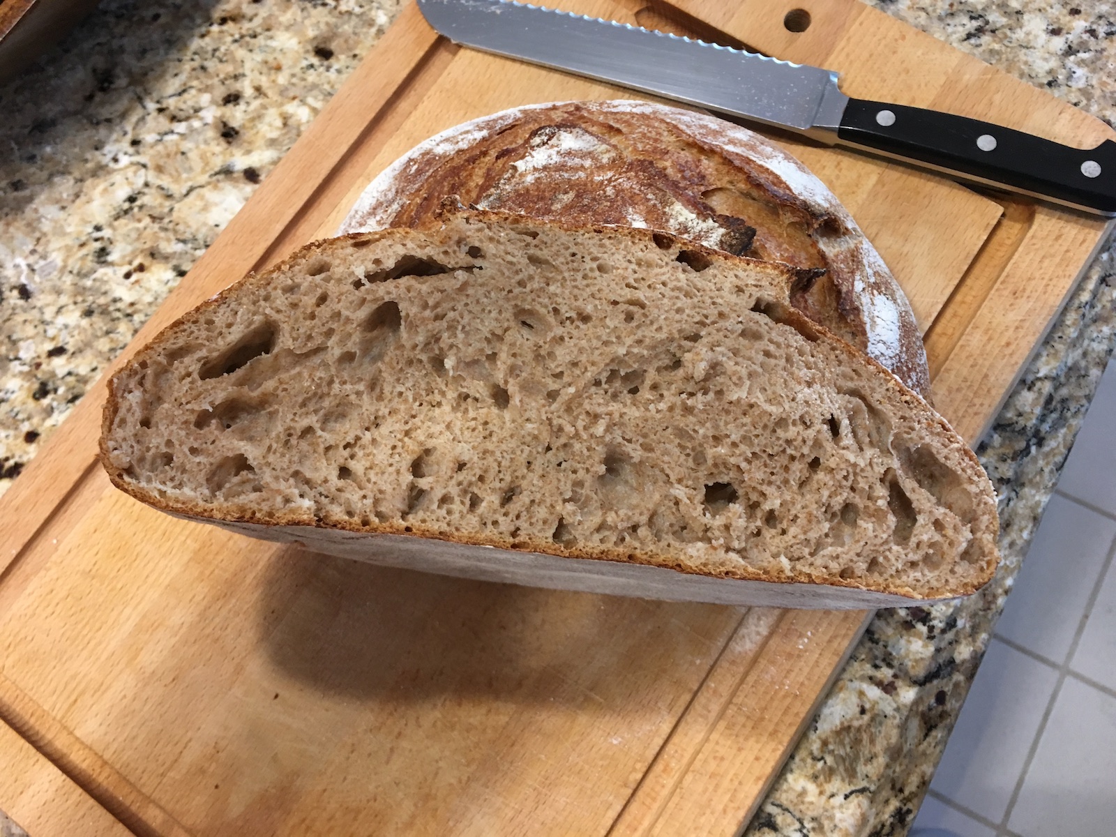 I have to say that I am universally pleased. Yes, I cut too early because everyone really wanted to try it fresh out of the oven and I wanted to get a good pictures of the crumb anyway. The crumb looks great. The crust looks great. It tastes as hearty and earthy as a great whole wheat bread should. The fact it was so much simpler to make than the Tartine loaf means I could easily see using this as a basis for breads in order to cut down on my overall time for baking. Really enjoyed this!