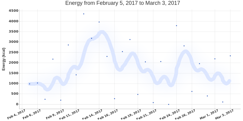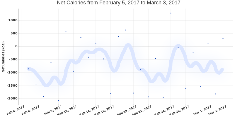 The dots are the values per day and the line is the locally averaged trend line. Looking at the dots I started off light, but that was after several weeks of falling off the wagon with goal accountability and knowing I had several days of vacation eating ahead, which is the spike shortly afterward. By mid-February I was back to my normal routine and you can see the oscillations between nearly no calorie days and regular calorie days. Obviously my “few hundred” calories has been violated in a few places on fasting days, but overall that’s what I’m shooting for. Diets that restrict down to 1000 calories or less, think that pregnancy hormone diet, are generally considered unhealthy. While there are some valleys below that they are followed by the weekends where things go drastically higher than that. When you look at it from a net-calorie perspective things look equally interesting.