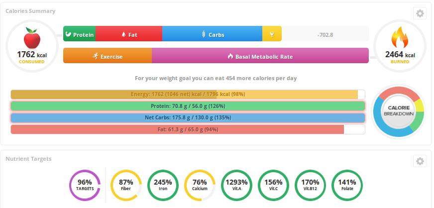 When it comes to any weight loss plan it should be asked if one is getting proper nutrition, are not starving themselves, and if they are being healthy on it. When I make a statement that I’m essentially not eating three days a week it makes it sound like I’m in severe calorie deprivation mode. In reality the total amount of calories and net calories average out about the same as a normal “diet” and I’m getting all my nutrition. For example, here is the chart of calorie consumption (h/t to CRON-O-Meter ):