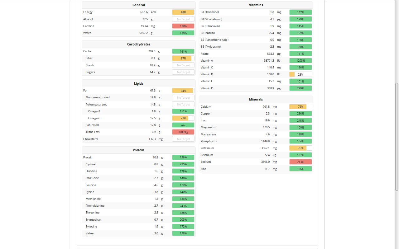 These are the averages over the same period of the rest of the graphs but without any supplements in the numbers. Average calorie balance per day is about -700 calories, with average calorie consumption at a bit under 1800, again squarely in standard ranges. Almost all of my macro and micro nutrient needs are met, as are all essential amino acids. I seem to always have problems getting enough Calcium and Potassium, this is no exception, but these numbers aren’t dangerously low. Vitamin D is very low but food sources of Vitamin D are hard to come by and I supplement to get around that.