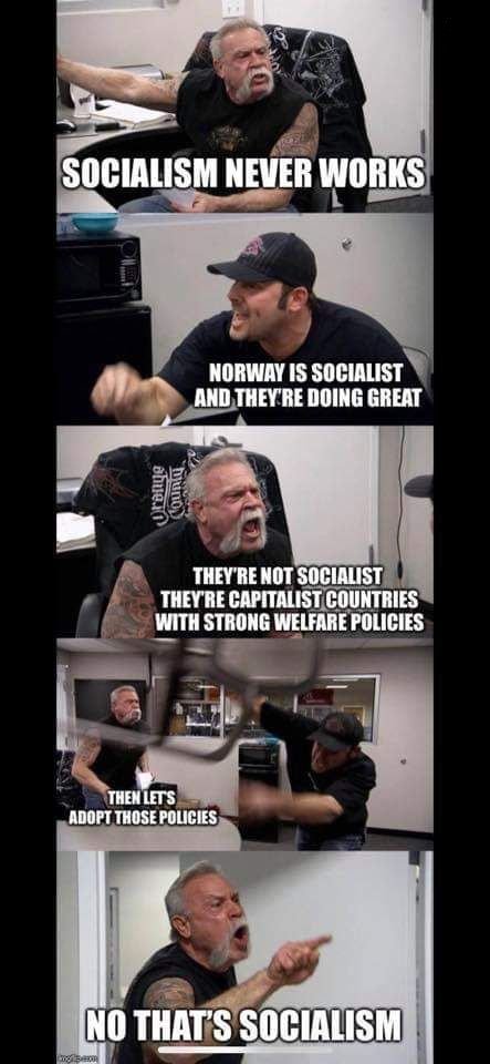 Purely for marketing purposes, I’m deliberately calling this area of development “Capitalism 2.0” and not “socialism.” This is despite the fact that the terms often discussed by socialism are nearly identical. Stripped down to basics, the central idea is that of workers and/or communities owning the means of production. However, the word “socialism” in the United States is toxic, and likely beyond repair. Most Americans—especially older Americans who remember the Cold War—are entirely unable to give the term “socialism” a fair hearing. This is the artifact of decades of Red Scare propaganda from the 1920s through the end of the Cold War. In our current era, members of Democratic Socialist parties have to constantly explain themselves whenever they encounter anyone outside true-blue liberal bubbles. The term “socialism” is quite literally used as slander for everything from single payer health insurance to a company that voluntarily decides to pay living wages . My favorite meme that encapsulates this dynamic is this: