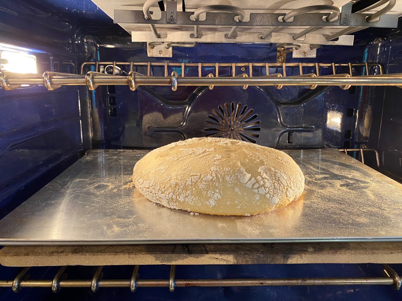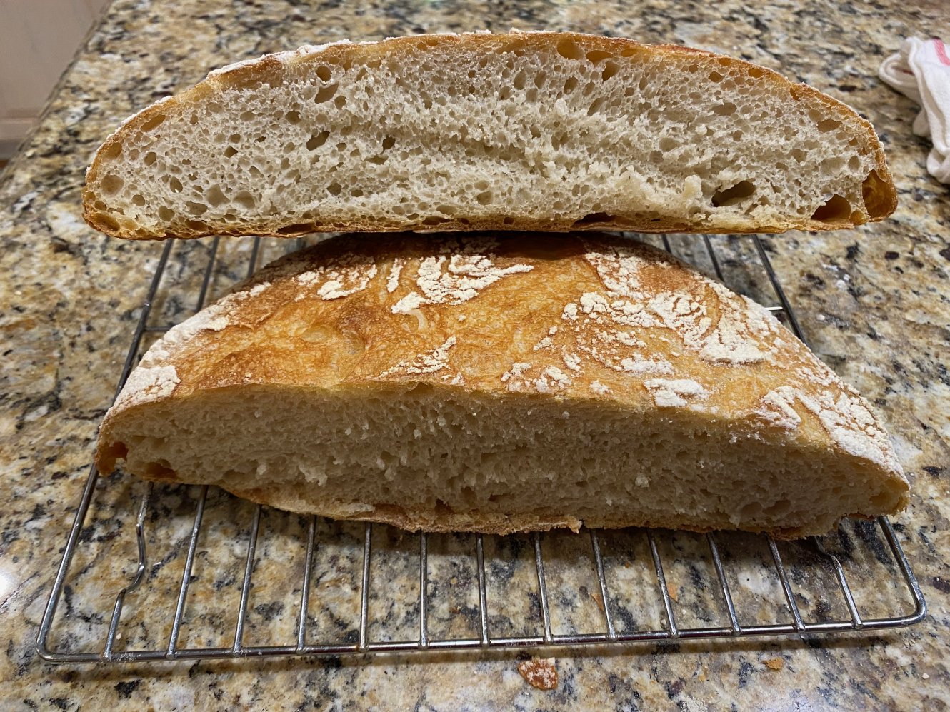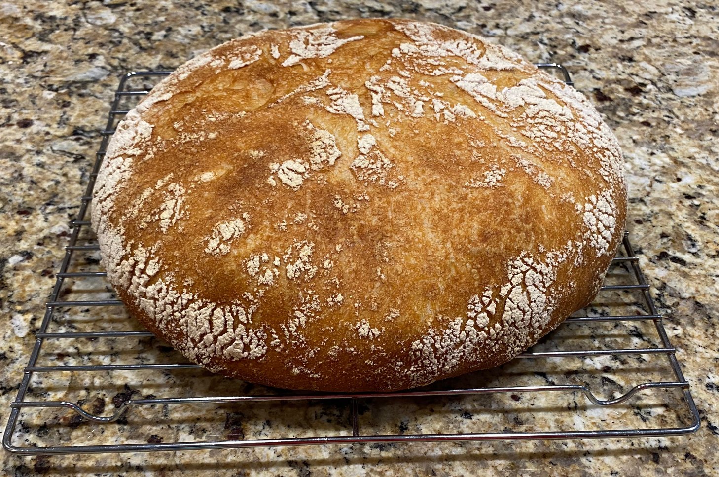 Step 11: Remove the bread from the oven and put on a cooling rack to cool for at least 30 minutes. You’ll hear the crust crackling as it initially cools. After it has cooled you can cut into it and eat. The final broad looks like this:
