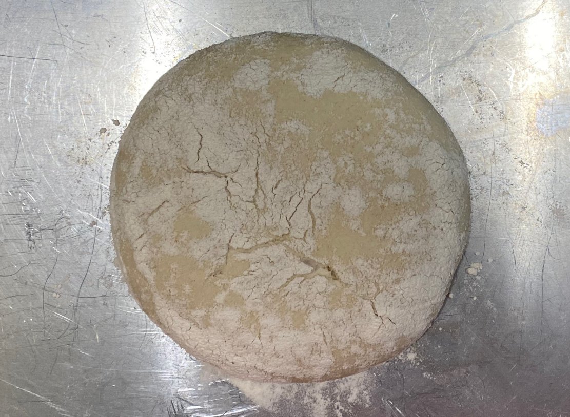 Step 2: Add the water to the bowl and mix together until fully combined. You can start with a spoon and then move on to your hands. You want to make sure that there are no dry bits of flour left and it is fully mixed.