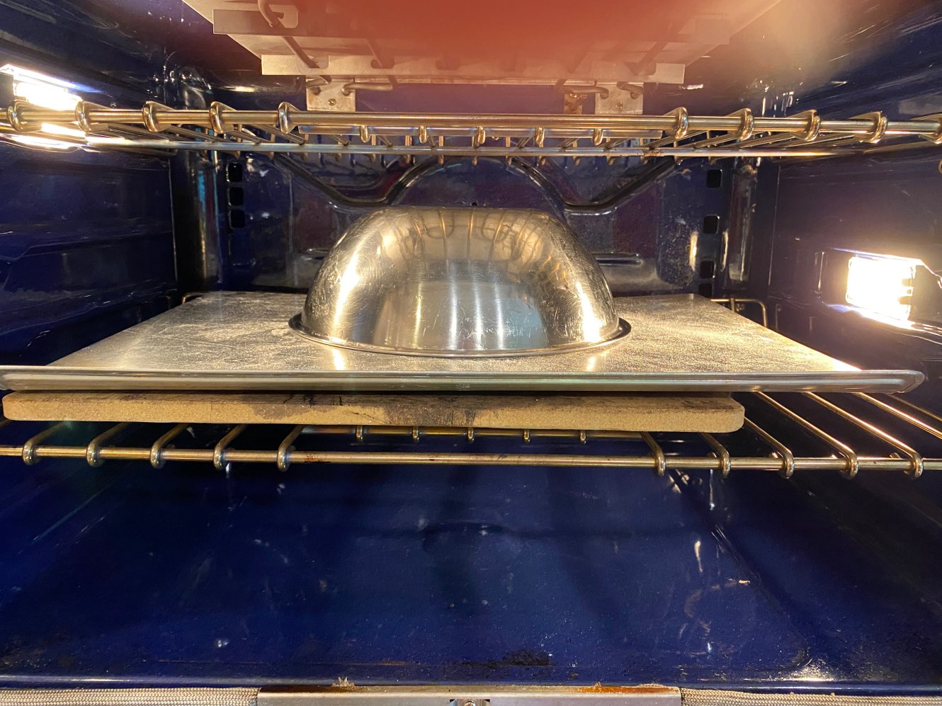 Step 5: Select an oven safe metal bowl which can easily fit the dough once it has more than doubled in size, which it will be doing. This will be the bowl we use during the baking step so making sure it is oven safe (no plastic handles, wood, etc) is important. You can just eyeball the size for this step. If you choose too large a bowl (like I did) it will simply lead to a potentially flatter loaf in the final product. Choosing too small a bowl will make later steps more complicated so best to err on the side of larger. Also make sure that it fits in the oven with your cookie sheet in the middle of the oven. Remove racks before turning oven on to be sure.