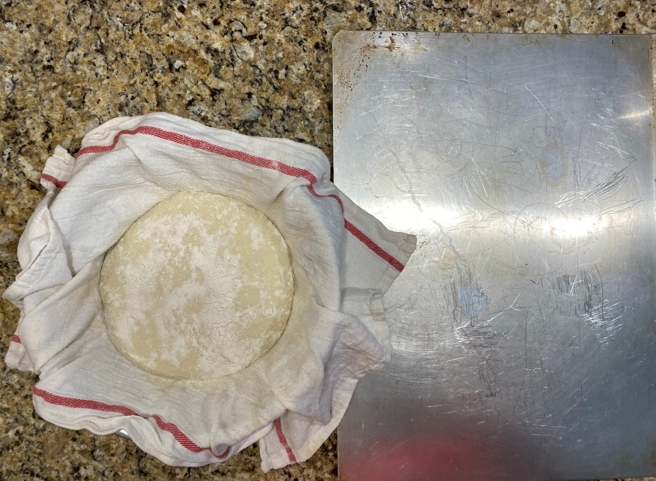 Step 7: 1.5 hours into the final dough rise preheat the oven to 450°F (232°C). When you are ready to bake the bread open the bowl and cloth as shown above. Generously dust the top (which will be the bottom) of the dough again to make sure it won’t stick to the cookie sheet. Put the cookie sheet upside down on top of the bowl and then flip the whole thing over. You now slowly lift the metal bowl off and then carefully peel back the cloth as well. The steps and result are below.