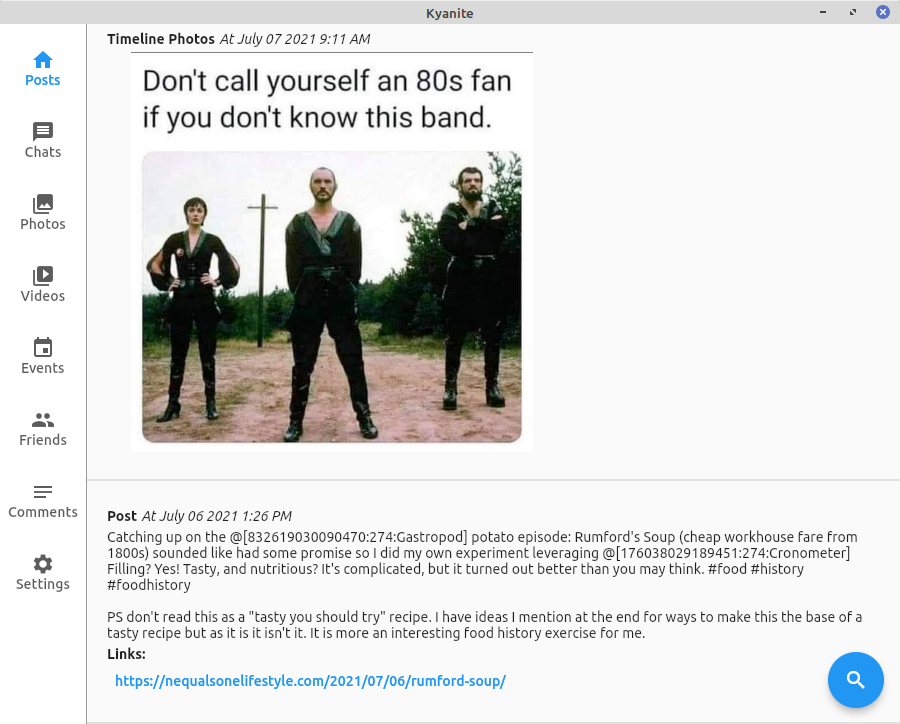 This post is about a preview release of a new tool I am working on to actually be able to use your Facebook Archive, which is called Kyanite . This tool is available for Windows, Mac, and Linux desktops. It will allow you to view, search, and extract data from your archive in a human digestible way. In same cases, like with search, it’s even more effective than the built in tools Facebook provides. Below is a quick tour of the product and how you can start using it. You can go right to the product page to start using it today. Also check out this post on how to get your Facebook Archive . Now on to the details of the Kyanite…