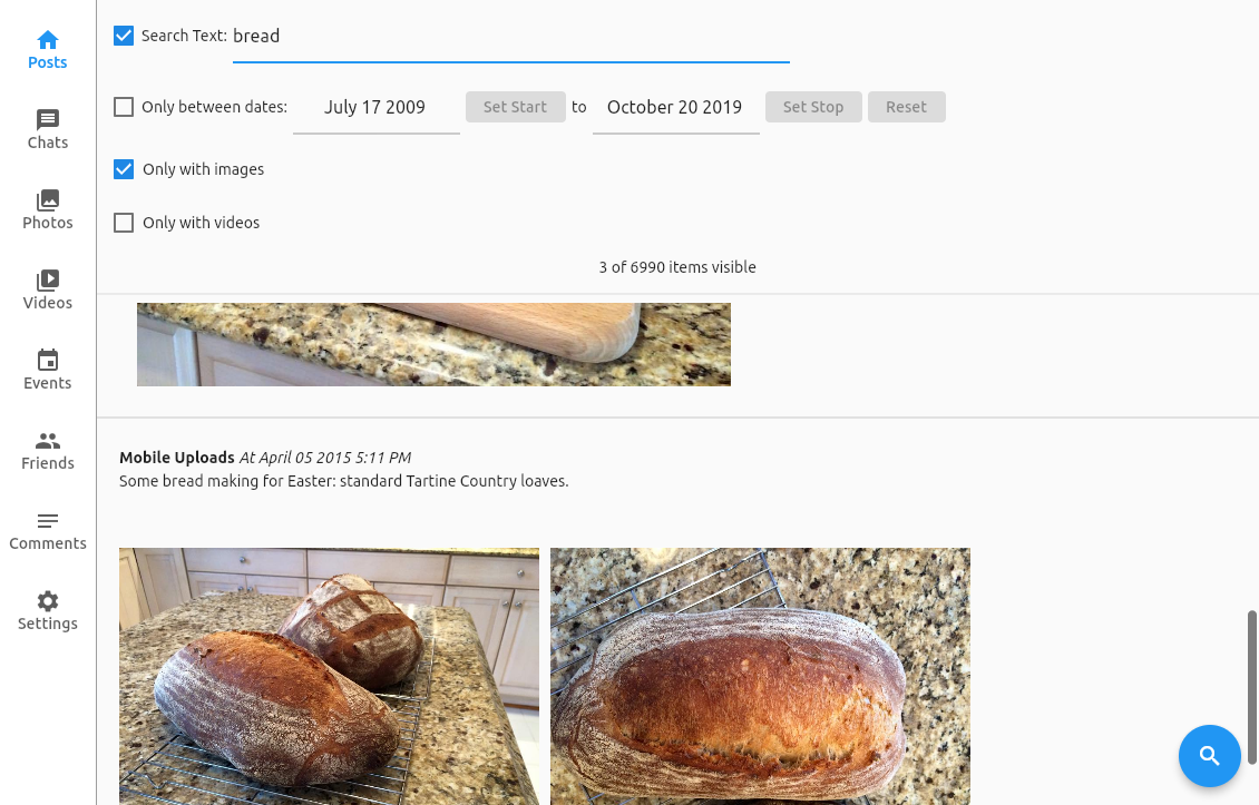 Toggling the visibility of the search fields is done by clicking the spyglass button on the lower right. This brings up the floating control panel where we can select filtering criteria that includes date ranges, free text search, and/or whether it has images or videos. In the above screenshot I’ve paired down posts to any that have images and include “bread” in the post text. At the bottom of the search bar it shows how many of the items, in this case posts, are visible versus the total number.