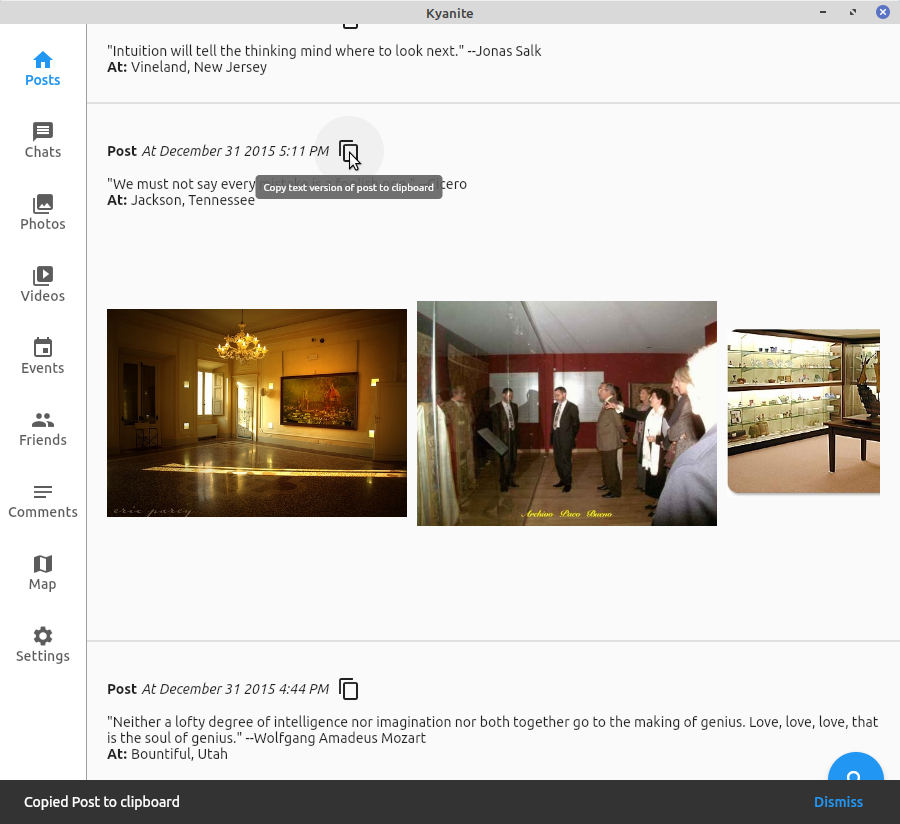 In Beta 1 users could select text to copy/paste it to the clipboard. However that would be cumbersome to get all of the post details. In Beta 2 we added a “Copy” button to each post/comment/conversation line. This button generates a human readable text only version of the post that is added to the system’s clipboard. In there will be things like the title, the post/comment/conversation text, the local path to the image files, the hyperlinks, etc. When the text is finished being copied to the clipboard Kyanite puts up a snackbar status to let you know it is completed, which will be nearly instantaneous. Below is an example of the plain text that is copied to the clipboard from a post: