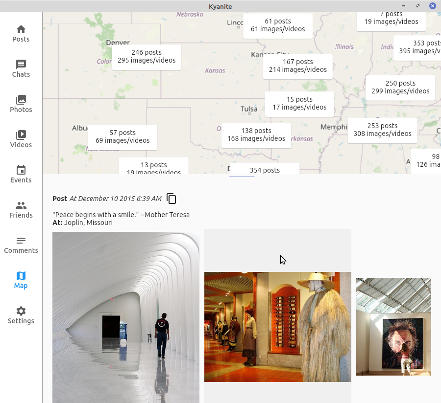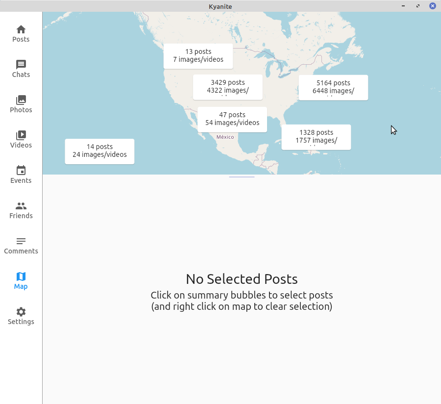 A few weeks ago I introduced the first beta of the Kyanite Facebook archive viewer. Today I’m announcing the second beta release complete with a bunch of bug fixes and new features. My favorite new feature is the map view for browsing/filtering posts that have geospatial information. You can get the latest version for download here .