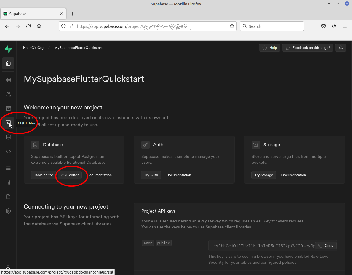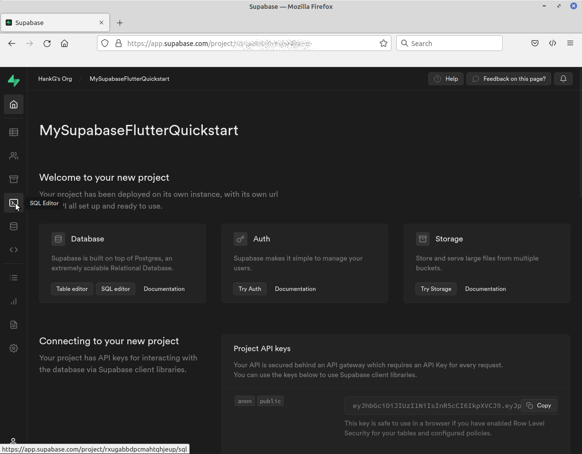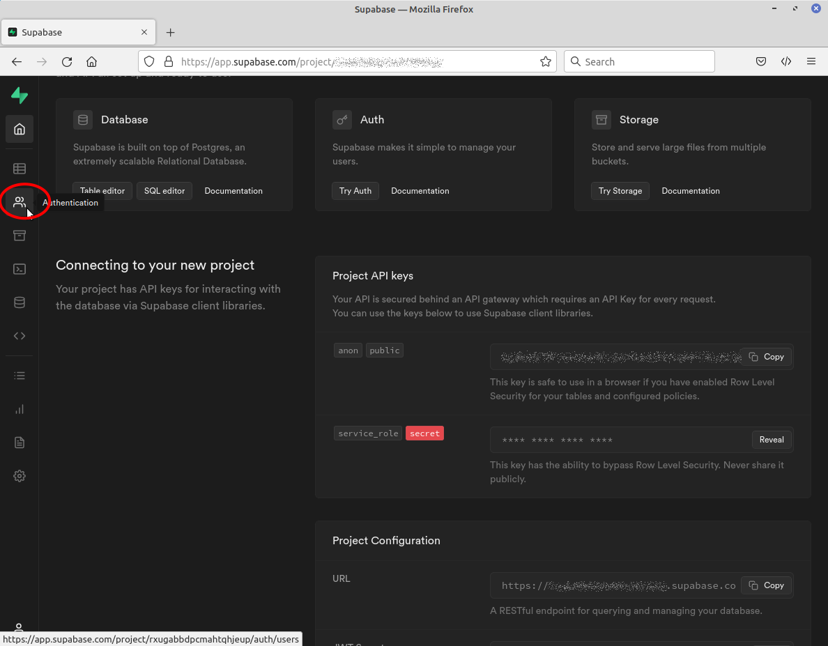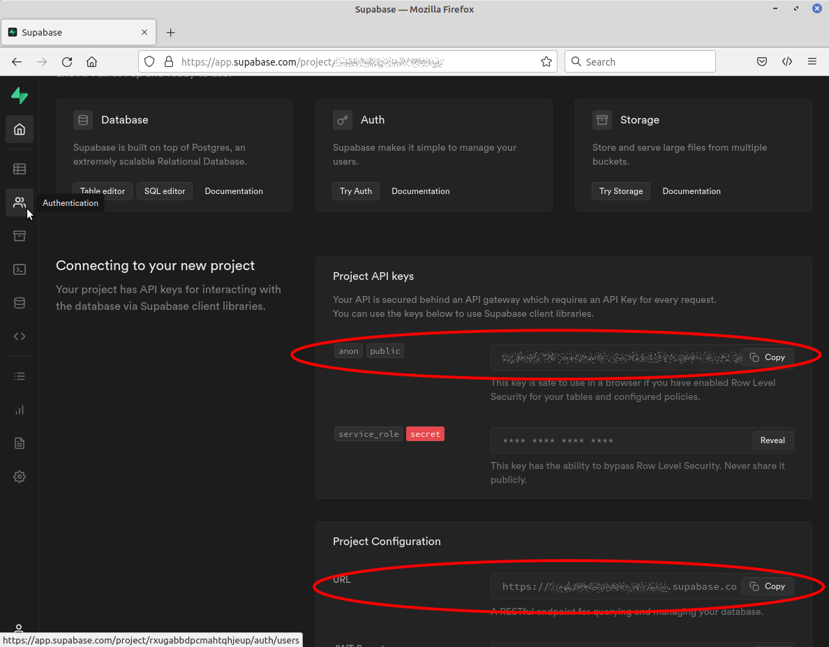 This will give you quick and easy access to the different parts of your project, as well as being able to get access to it via the toolbar on the far left. Two values we will want for later on this screen will be the “anon public” Project API Key and the Project URL. Both are circled in red below: