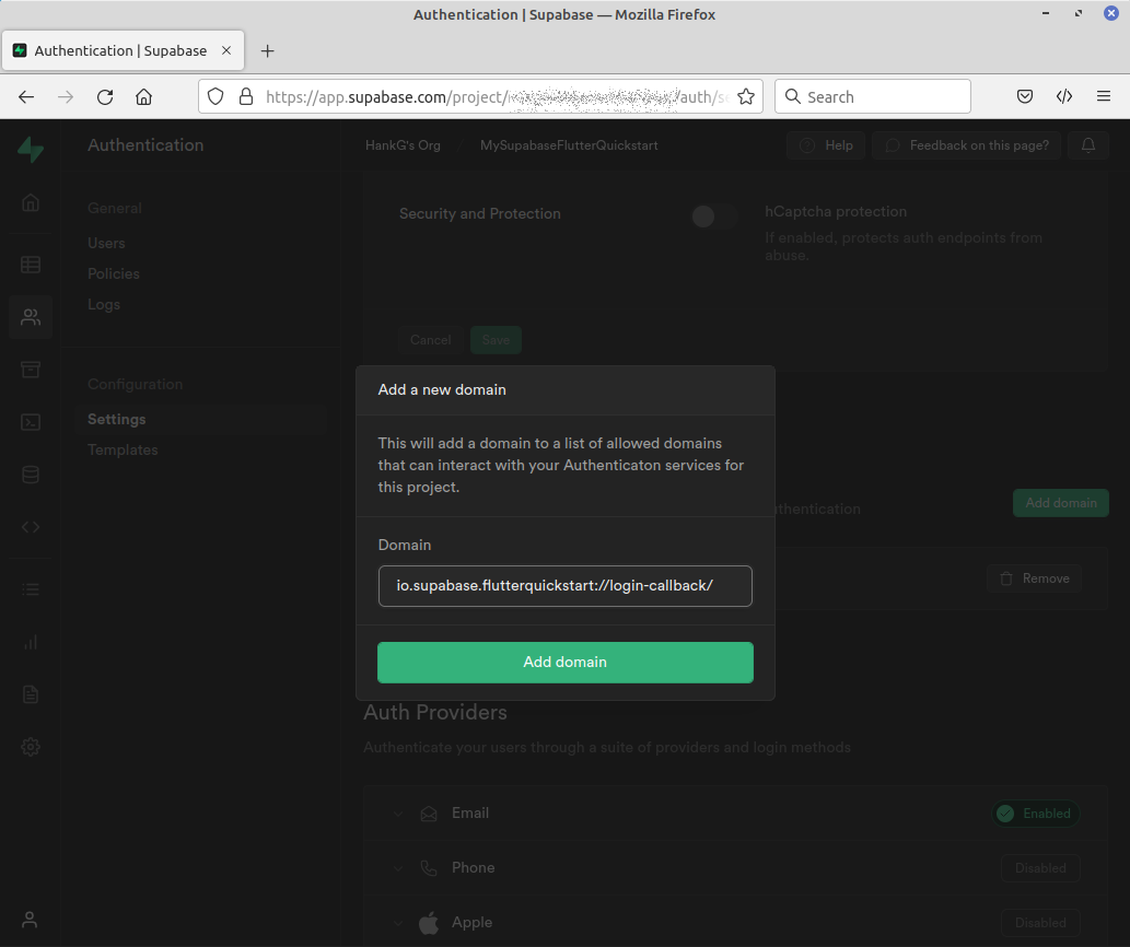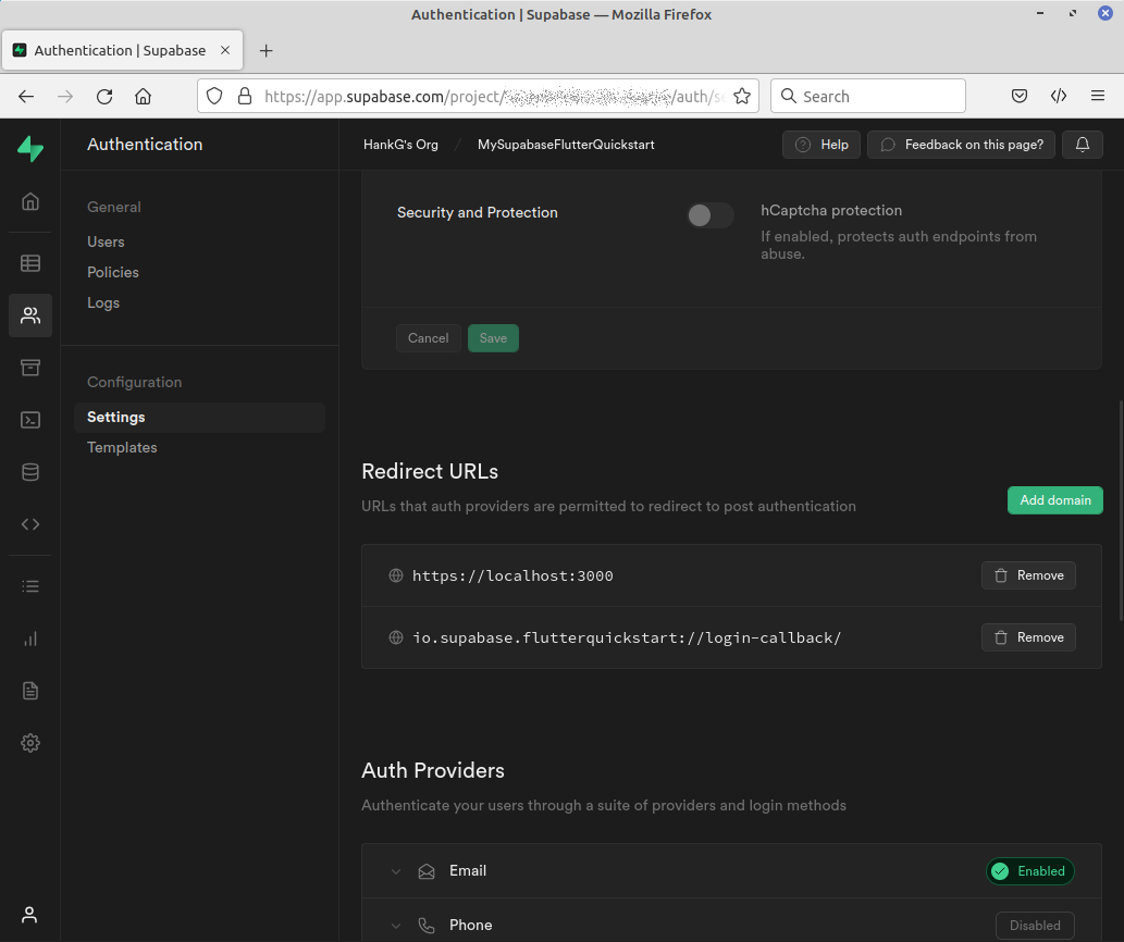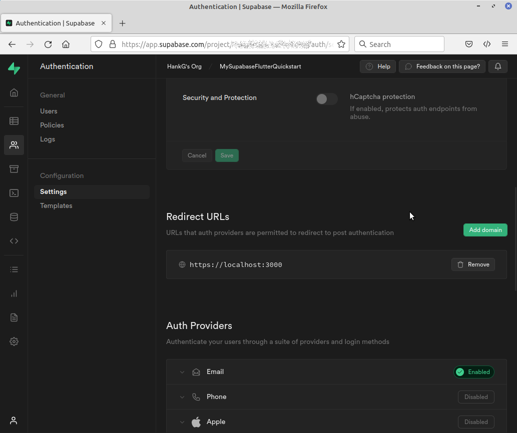 Then click on the “Settings” option to bring up the project’s authentication settings. We will want to add a redirect for our applications. Scroll down to the Redirect URLs section and you’ll see the one for localhost, which will be sufficient for the development web based deployment scheme.