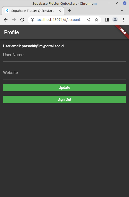 Again there is a lot of standard Flutter UI stuff but we are doing some more Supabase specific stuff in the initState, _signOut, _getProfile and _updateProfile methods. The _getProfile method is used to populate our page with information from the database. The core of it is: