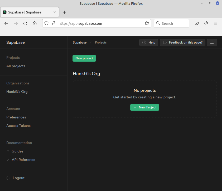 Go to https://app.supabase.com/ , the main app dashboard for your user. If you don’t have one you can easily create one with your GitHub account (the only way to make a user at this time) through single sign on. Once that is created you will be presented with the project dashboard showing all of your projects (which you will have none):