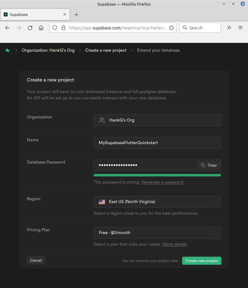 The defaults should be good for all these fields. Choose whichever name you like. For the database password, this will give unfettered access to your data so it should be a strongly generated one. There is a convenient link on the screen that will auto-populate that field with a strong password which you can then copy out and store in your password vault. With those options chosen click “Create New Project”.