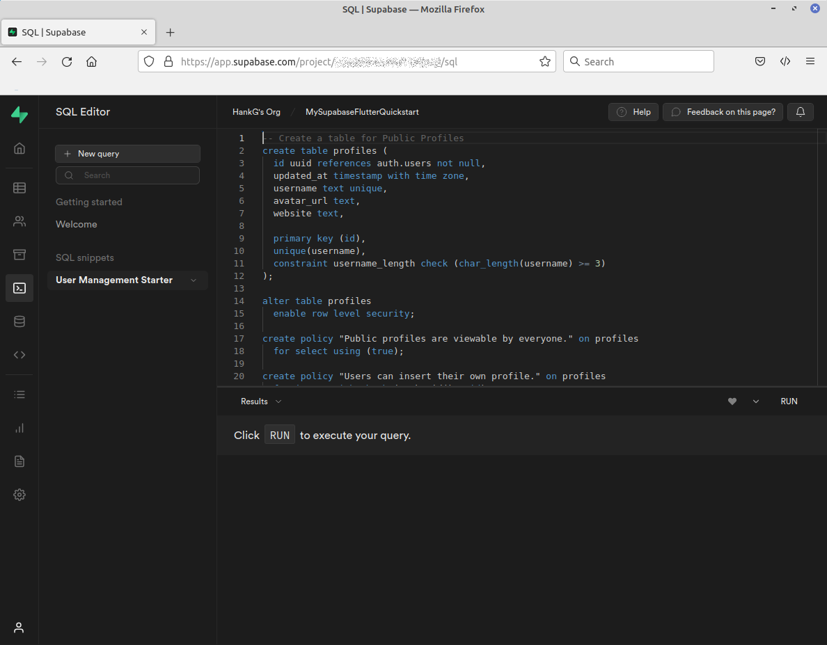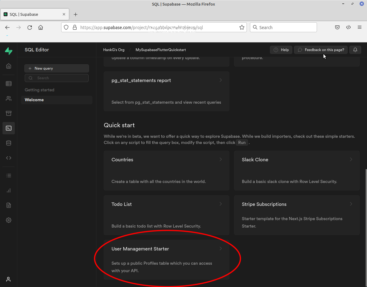 The backend layer of Supabase is a well configured PostgreSQL database with data replication, back ups, row-level encryption etc. You can see a whole host of other Postgres extensions that can be applied to it. Therefore at any point you’ll be able to directly manipulate the database in the same way you would a Postgres installation you built from scratch. However Supabase does have some easy getting started scripts for showing you the way. One that we will use is the “User Management Starter” which is tailored for this tutorial.