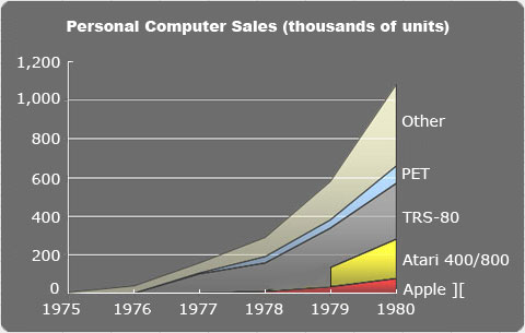 As one can see, and this data was available albeit harder to come by back then, Apple wasn’t moving anywhere near as many units as Tandy or Commodore ever did. So the top level claim is bunk. But they take it one step further in the smaller print:
