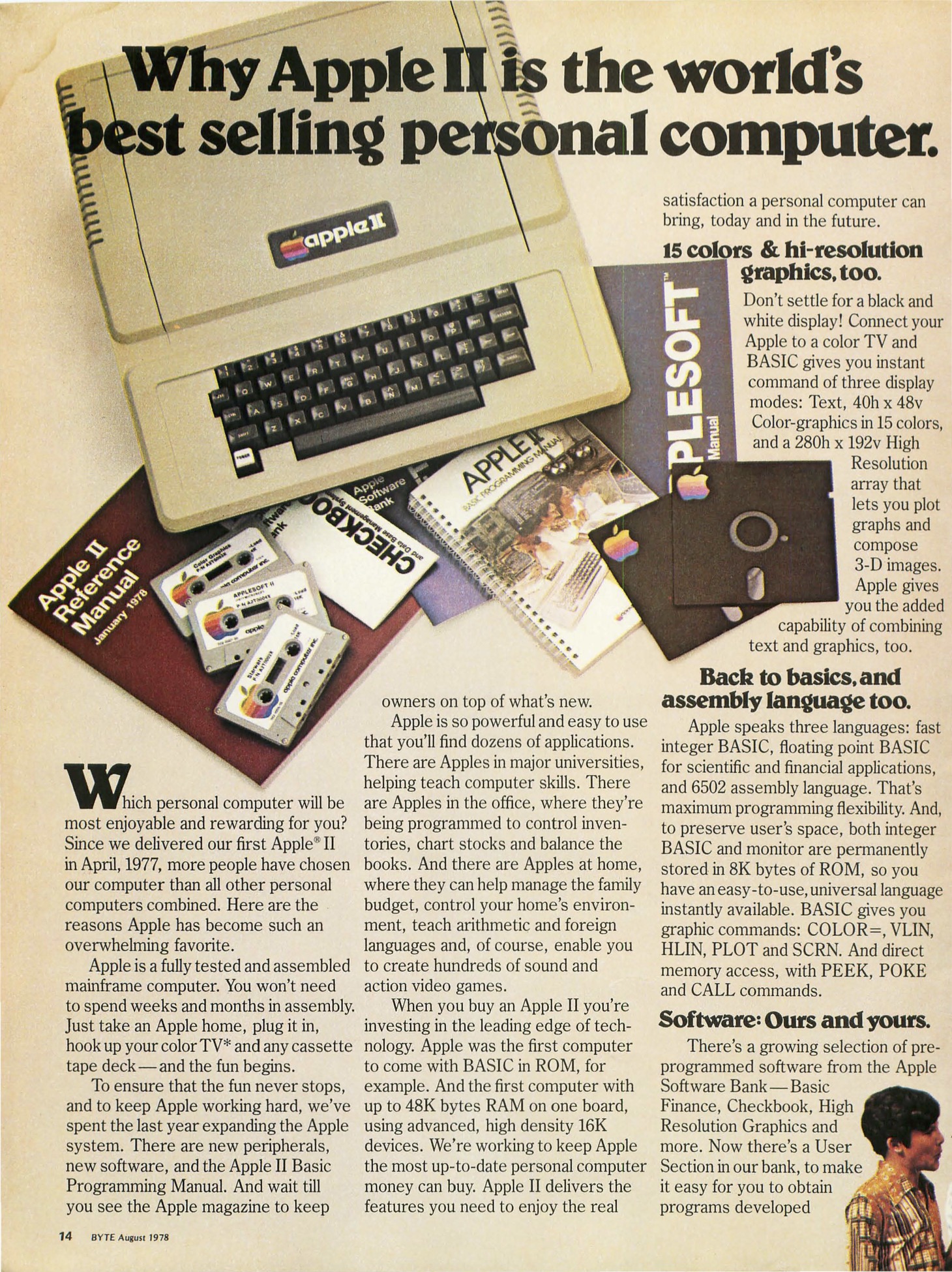 Apple was at the leading edge of the personal computer market. The mythology that has built up around it, perhaps because they were the only ones to survive through the 1990s, is beyond parody at this point. The amount of mythology building they were doing at the time in their ads though, by evidence of this one from 1978, is probably a factor as well.