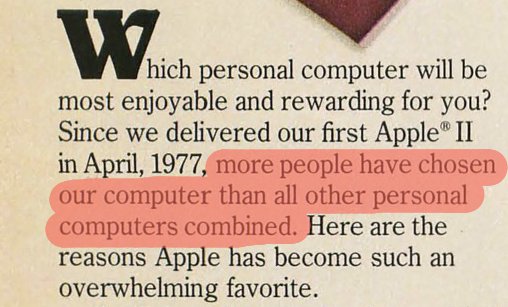 As was pointed out in the Ars Technica article, this was at a time when Apple only sold 600 computers in 1977. Further down in the ad they use some other weird language to imply capabilities beyond what they had such as calling it a “mainframe computer”. This was when these were called “microcomputers” to distinguish it from the much larger “minicomputers” which were smaller versions of “mainframe computers”. I’m not sure why they would use that language except perhaps that they were targeting a broader consumer market that they thought would be impressed with such a claim. They also boasted the ability to have 3D graphics and exaggerated the sound capabilities as well.