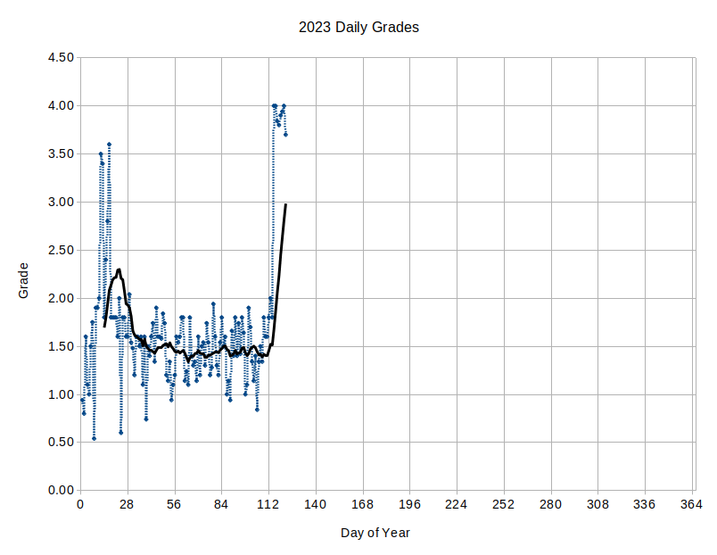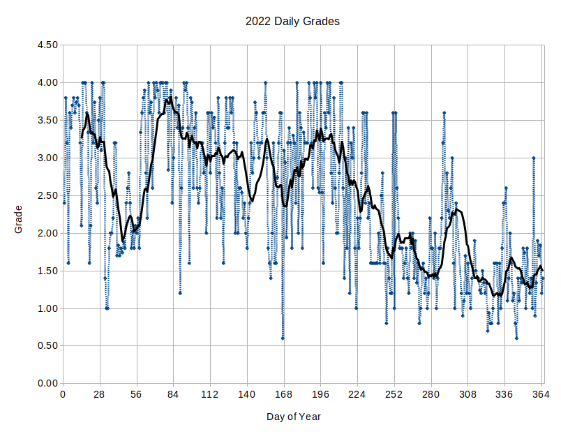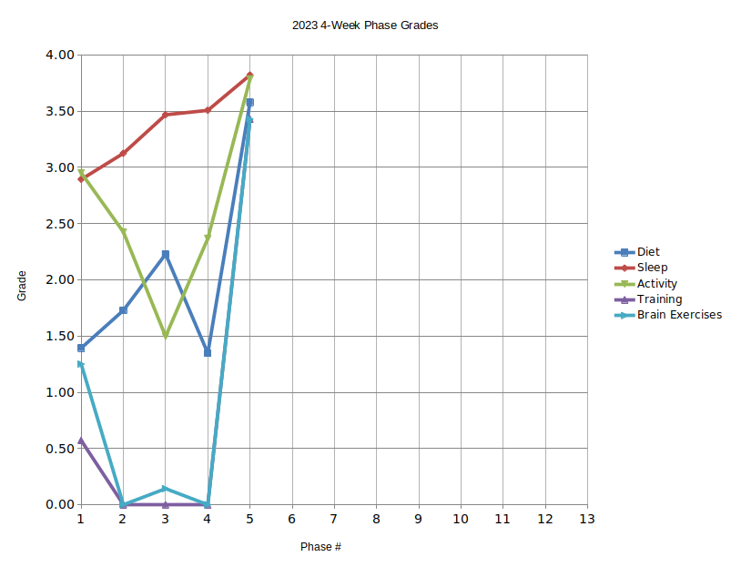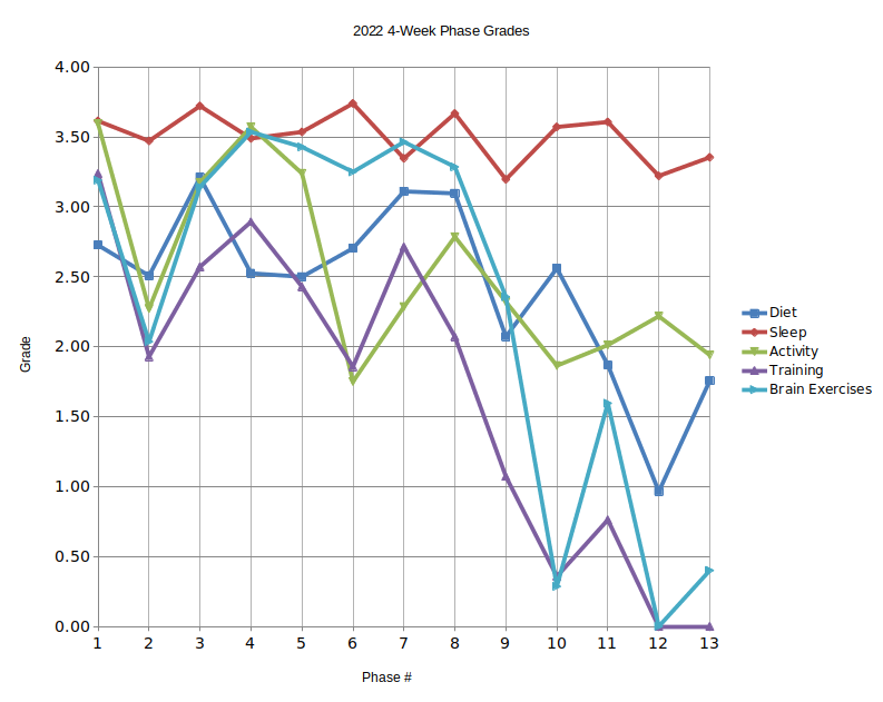 I’ve documented goal accountability many times, but at least with each annual review such as in the 2021 Annual Review (still haven’t 2022’s review but have the data). Essentially it applies a four point scale grade, just like in school, every day to each of five categories of my choosing to target. These categories are pretty static and are derived from pretty standard advice on things that help increase longevity. This includes things like having a good diet (Goal #1), getting enough sleep (Goal #2), getting enough activity (Goal #3 and #4), and keeping my mental faculties up to snuff (Goal #5). How I choose to do that over any given period is 100% subjective though. Perhaps the dialed in diet for one period could be 100% whole foods vegan. In another phase perhaps it is just a “Blue Zones” inspired diet. The arbitrariness shouldn’t mask bad behaviors. It is against the whole process for me to choose a diet goal of eating nothing but fast food. Beyond that though the grade is about how much I’m adhering to the goal, or not.
