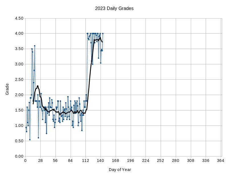 No surprise if I felt the need to do a health reboot that I wouldn’t have had things dialed in leading into it. The veritable step function in the daily grades graph is a testament to that. There are several perfect scores with some hits in there for when I either didn’t get enough sleep, didn’t eat well, or a combination of the two. Since I got perfect scores on the other three goals that is the only place those daily grades could be dinged.