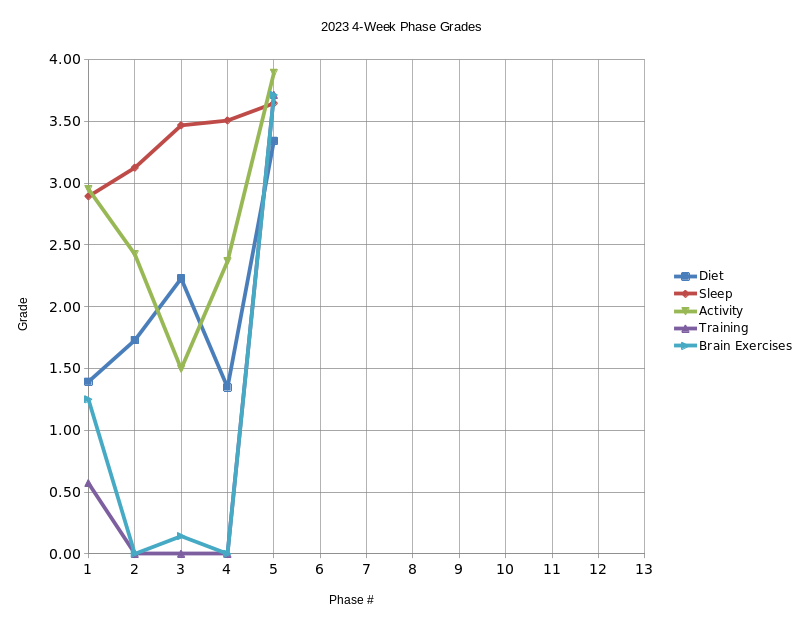 This is a quick refresher of how this works. The “Goal Accountability” method is to give myself five focus areas each day which help contribute to longevity. Technically it can be any five things but for me these have historically always fallen into the categories of: diet, sleep, cardio movement, strength movement, and mind exercises. For each day one is given a numerical grade like in school from 0.0 (F) to 4.0 (A). By keeping track of those things we can see how we do by week and over the year. To give myself opportunities for feeling the “new years resolution” type psychological prodding more than just once a year the whole year is broken up into four week “phases”. Therefore I can see how things are going over the year and at an approximately one month interval have an opportunity to start with a clean slate and “get a good grade”.