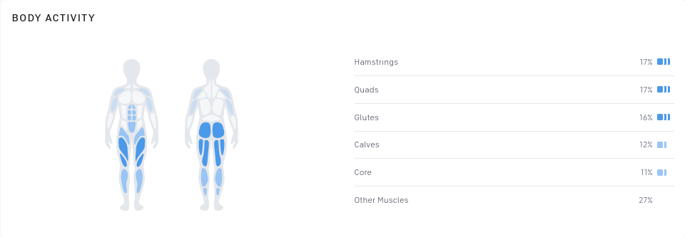 As I wrote above, almost all of my real effort for the 30 Day Health Reboot Challenge was stationary bike cycling. I did almost all those runs on a Peloton, which has clip pedals. That means that hypothetically the workout have both pulling and pushing force motion unlike if one were to just ride the bike with regular pedals. If I look at the muscle usage diagram Peloton provides you can see that hypothetically both the front of my legs and the back of my legs, glutes, etc. are getting a good workout. Having had fatigue all over my legs as I ramped up exercising I can tell you this diagram isn’t completely wrong. The recovery I felt from this run however shows that this cycling training is far from uniform like this.
