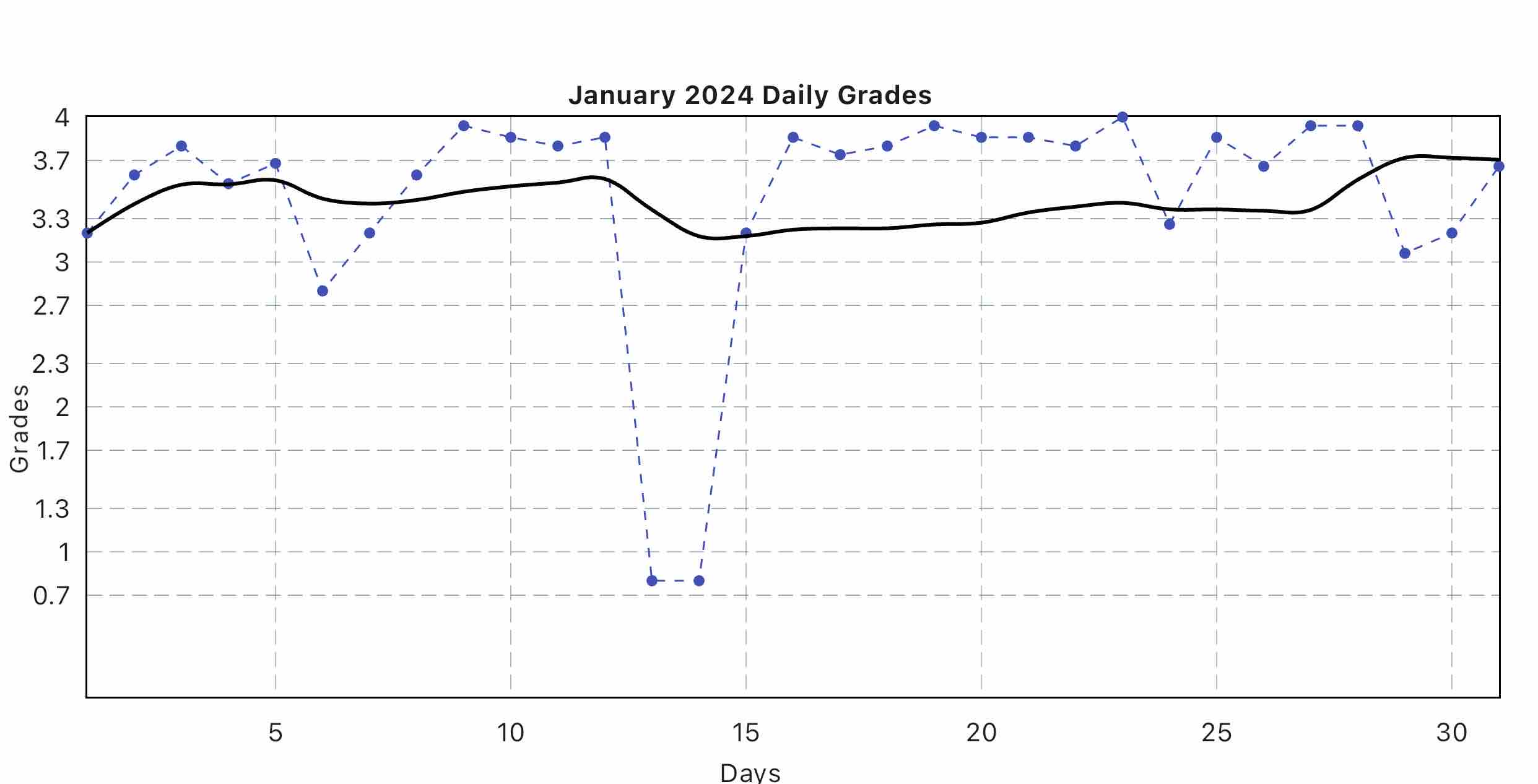 First lets look at the aggregated daily grade. Overall I maintained a pretty high daily grade in aggregate. There was a huge dip in mid-January due to some travel for a family event. On those days I didn’t get none of my cardio, non-cardio, or brain exercises in. My diet was very indulgent as well so that was a goose egg too. Sleep on one day was solid but on another it wasn’t so great. So that was a good sized hit. But for the rest of the month things looked very solid, near or above the 3.7 (A-) level. Looking at the per-goal grade though we see some areas of improvent.