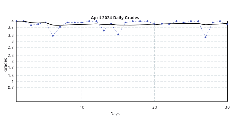 April was supposed to be an easier month for me. That turned out to be kind of true. Goal Accountability grades definitely reflect that. I’m happy with the performance.